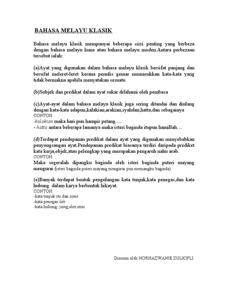 Contoh Ayat Bahasa Melayu Klasik